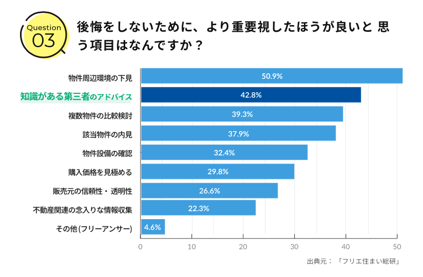 次に「後悔しないために、より重要視した方が良いと思う項目はなんですか?」という質問には、約42%もの人がが選んだものは「知識がある第三者のアドバイス」です。これは言い換えると「セカンドオピニオン」を持つということですよね。