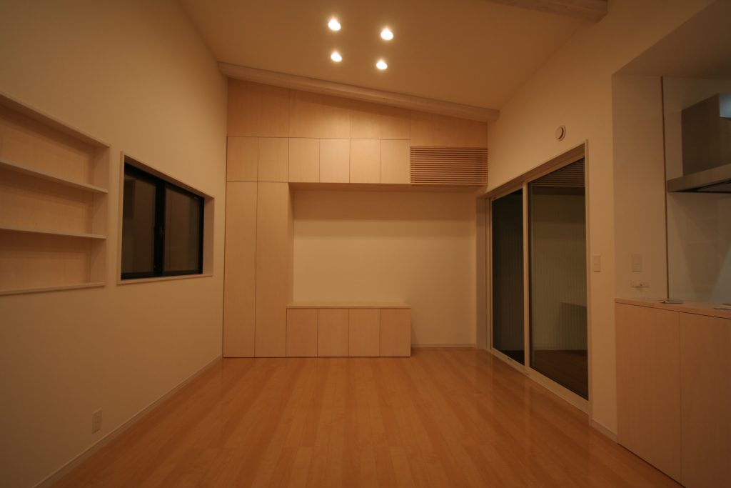 このテレビボードは、2階のリビングに設置されたものです。よく見ると天井が斜めに傾斜しています。その斜天井の形状に合わせてテレビボードを作成・設置されたものです。スペースを無駄にすることなくデザインできるのも造作家具ならではですね。