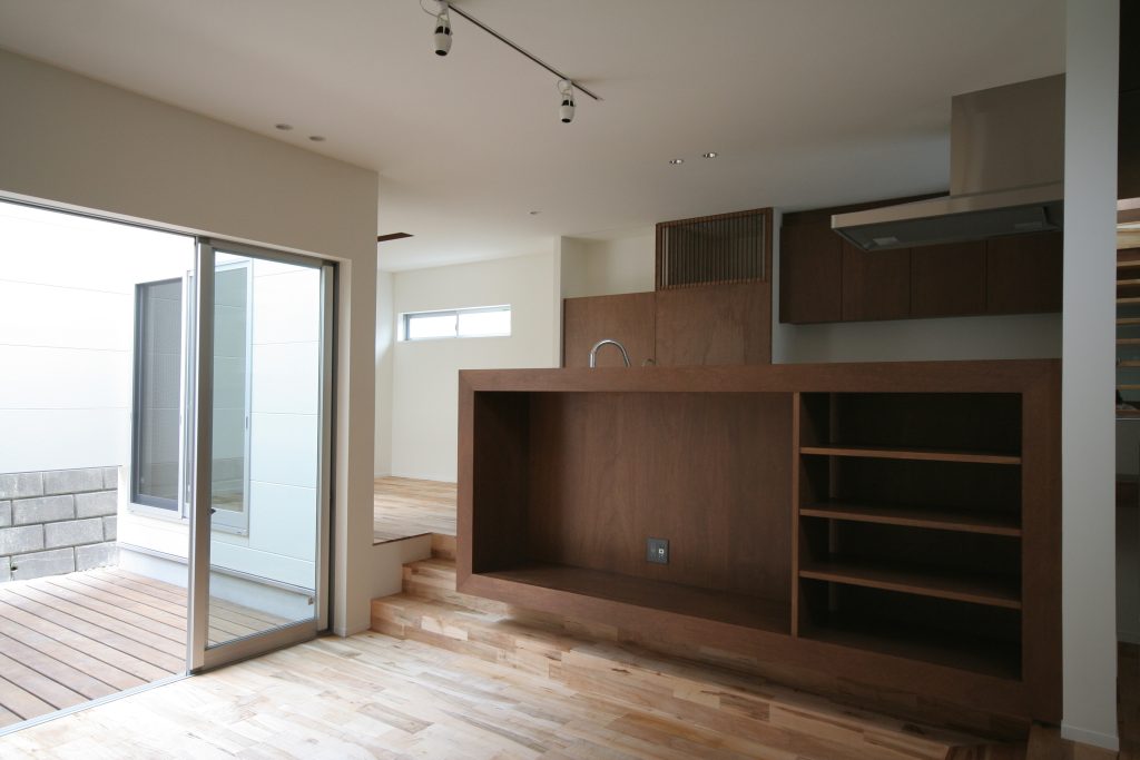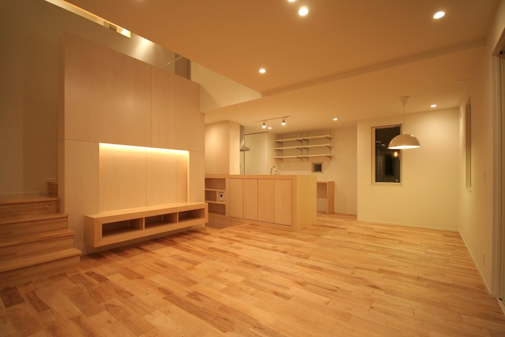 これ、テレビボードですが、実はキッチンの背面部分なんですね。あえてキッチンからリビングに床段差を設けてキッチンに立つお母さんが炊事をしながら、リビングでくつろいでいる家族とのコミュニケーションが取れるというもので、床段差を設けたことでテレビを視聴する視線がが下がらないのが良いポイントです。こういった家具だけでなく、建物全体で調整ができるのも造作家具のメリットです。