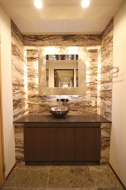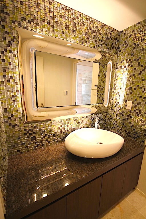 安価な既製品家具の収納カウンターに「天然石の天板」を乗せただけのもので、たったこれだけで素敵な高級造作家具に仕立て上げることができます。