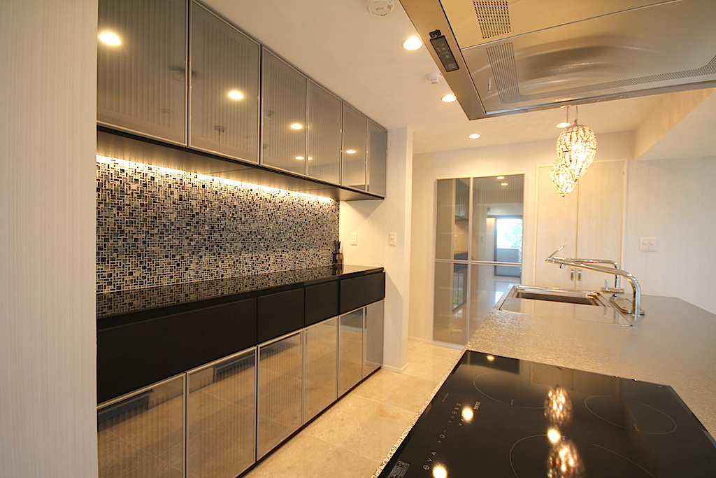 最後に紹介するのが、オリジナルカップボードです。これも基本部分は既製品家具のカップボードにガラス扉と吊り戸棚の組み合わせです。これに先ほど同様に既製品カップボードに「天然石材の天板」を乗せて、吊り戸棚と下部カウンターのガラス部分に透かし模様の入ったガラスフィルムを貼っただけのものです。これだけで、グッと高級感が増し、ワンオフ製品のような高級家具に生まれ変わります。
