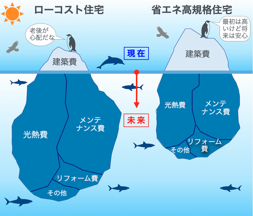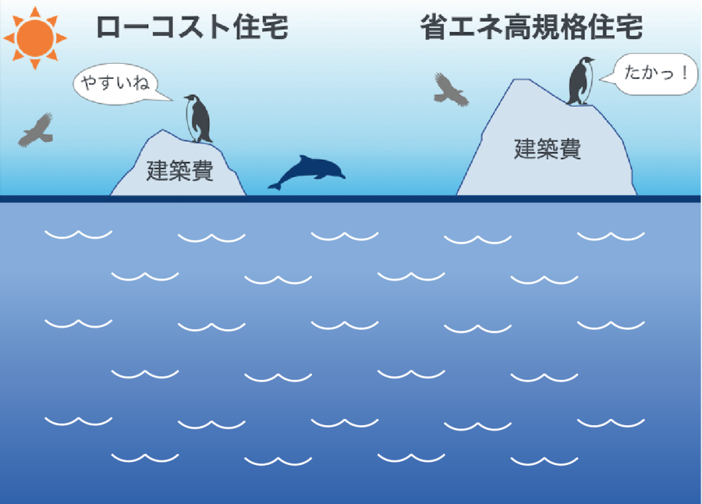 一方、「ローコスト住宅」はコストを抑えたものなので、耐久性は重要視されてません。それよりもコストです。両者の断熱性能にも当然差が生じ、それは光熱費となって反映されます。そういったことから、水面下の氷の大きさはローコスト住宅の方が大きくなるというものです。