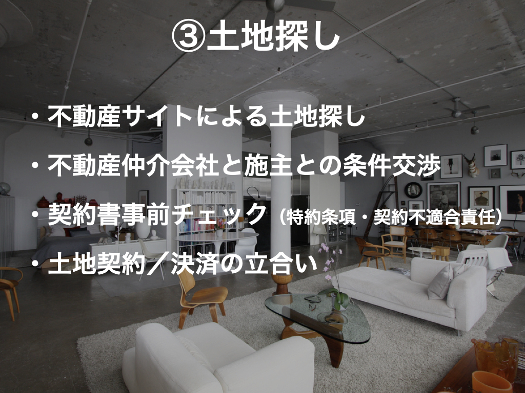 土地の購入は細心の注意と準備が必要となります。土地固有のリスクの顕在化とその解決費用の算出も重要です。購入申し込み(買付け)に際しての金額条件交渉などもあったり、契約書に加える特約条項の事前チェックなどもあります。