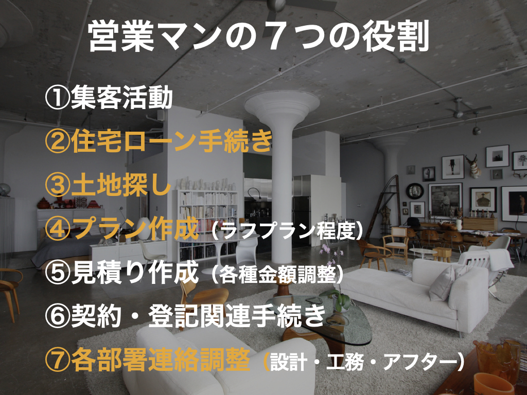 本日の投稿内容は【営業マン】についてです。ハスメーカーで家づくりを検討する場合、最初の接点から始まり、住宅が完成する最後の引き渡しまで施主(オーナー)とお付き合いするのが営業マンです。私の営業マンとしての経験から思いつく役割をを書き出してみました。