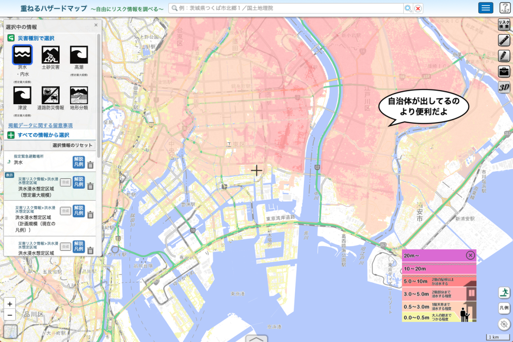 最後に、国土地理院が運営しているサイト「重ねるハザードマップ」は、「洪水・内水」、「土砂災害」、「高潮」、「津波」などを確認できるだけでなく、その場所に災害別に重ねてみることができるようになっています。