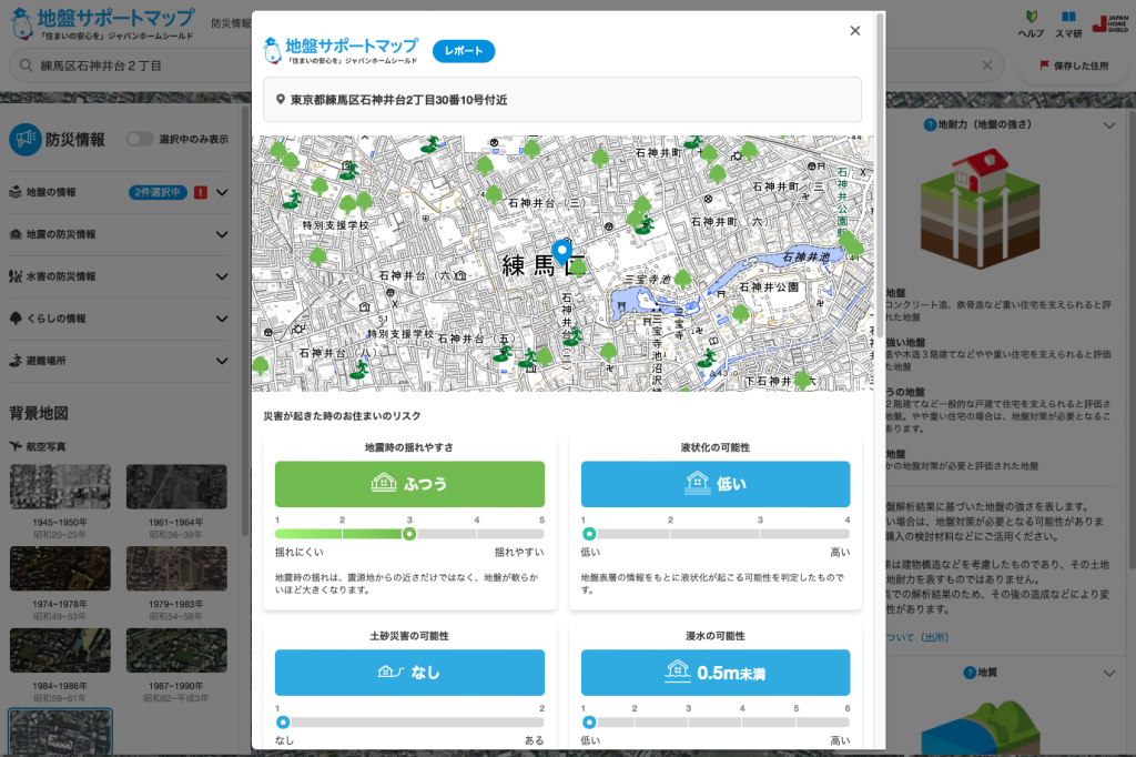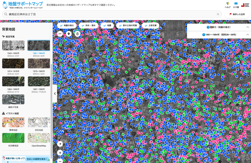 家を建てるのに最も大切なのが地盤です。地盤調査会社ジャパンホームシールドが提供する「地盤サポートマップ」では、1945年から現在に至るまで、該当地の航空写真と共に地盤の強度をマップ上にて確認することができます。