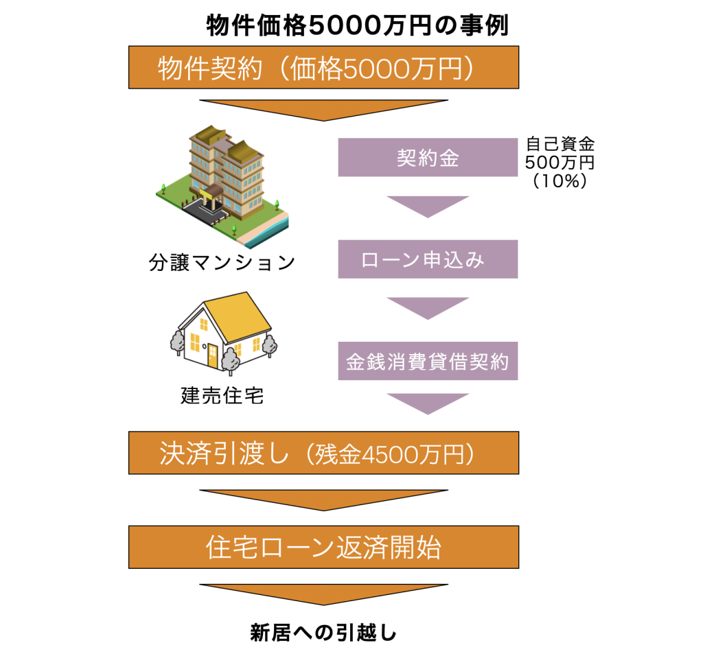 上の図は、一般的なマンション・建売住宅の購入の流れです。建物は既に完成しているので、契約時の契約金だけ自己資金で支払い、完成引き渡し時に残金決済を住宅ローンで決済すれば、その翌月から返済スタートという流れとなります。非常にシンプルですよね。