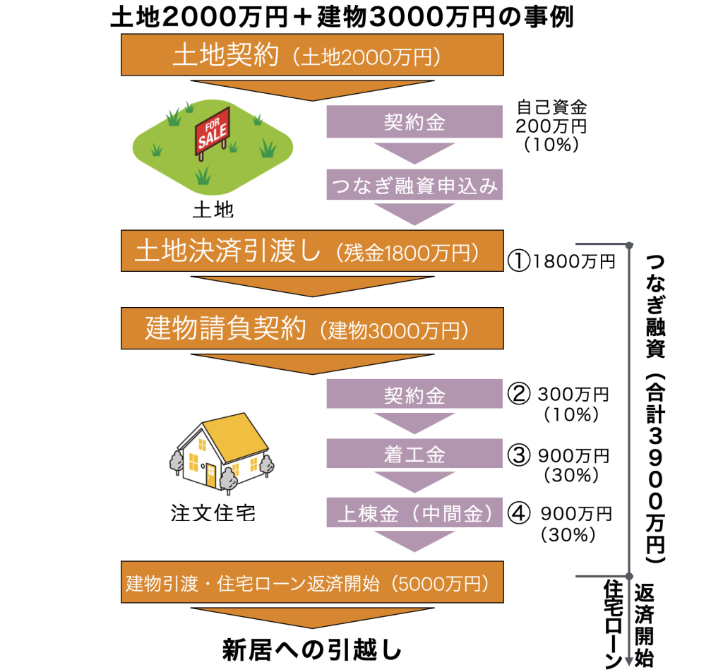 上の図は、注文住宅+土地取得のケースです。①土地の契約金1800万円は自己資金で支払い、②~③の建物の3回払い(300万円+900万円+900万円)の計3900万円をつなぎ融資で土地代と建築会社に支払います。
