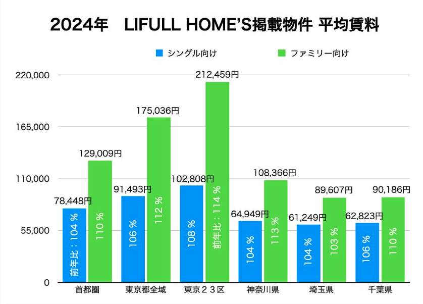 特に、ファミリー向けの賃料の上昇が顕著です。東京23区では114%もの上昇です。現在の平均賃料が212,459円で114%の上昇率なので、昨年からの1年間での上昇金額は26,092円にもなります。これは大きいですよね。