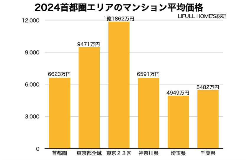 グラフを見ていただくと、東京都が突出しているのがわかります。東京23区については1億円の大台を大きく超えて1億1862万円、東京都全域でも9471万円と1億円に届く勢いです。またその東京に引っ張られるかたちで首都圏の平均価格も上がっています。