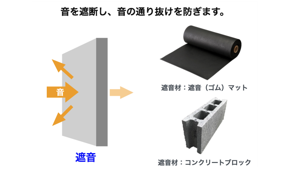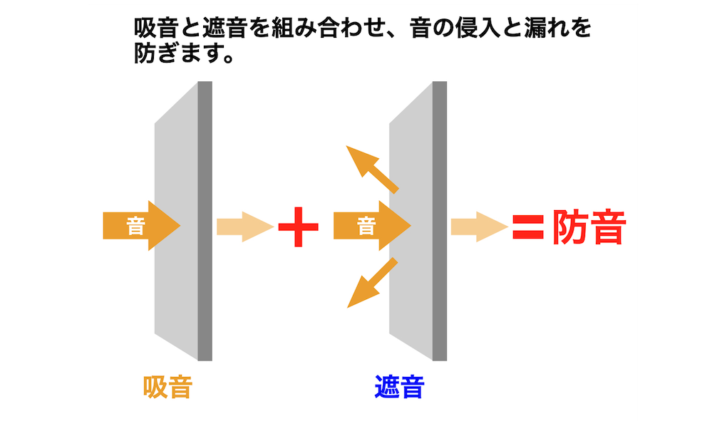 室内の反響を抑えるのが「吸音」。音の侵入や漏れを防ぐのが「遮音」。そして吸音と遮音を組み合わせて外部からの音の侵入や、外部への漏れを抑えるのが「防音」です。