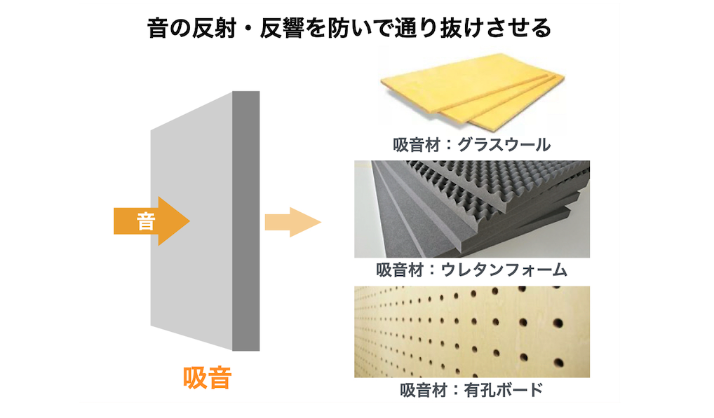音を吸う?という表現がわかりにくくしているかもしれません。吸音とは、音の反射・反響を防ぐことです。吸音材といっても種類があります。上に挙げた吸音材は主に音楽室やスタジオなどで使う素材です。