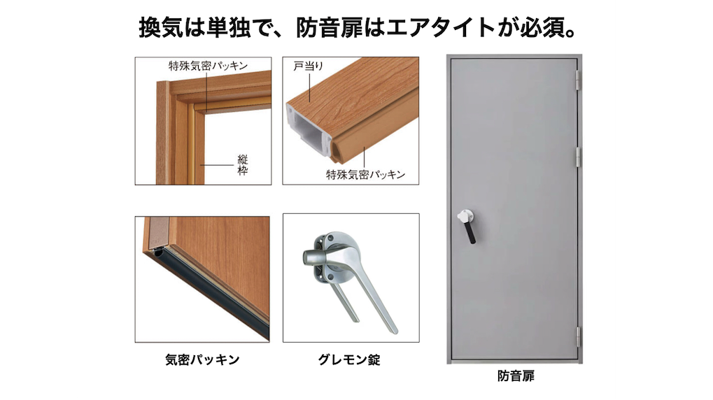 最終的な仕上げとして、遮音性を高めた専用の防音ドアが必要です。遮音性は気密性でもあります。ドアとドア枠の設置面には遮音パッキンやドア自体をドア枠に押し付ける役割のグレモン錠などで「エアタイト仕様」にしてしっかりと音漏れを防ぎましょう。