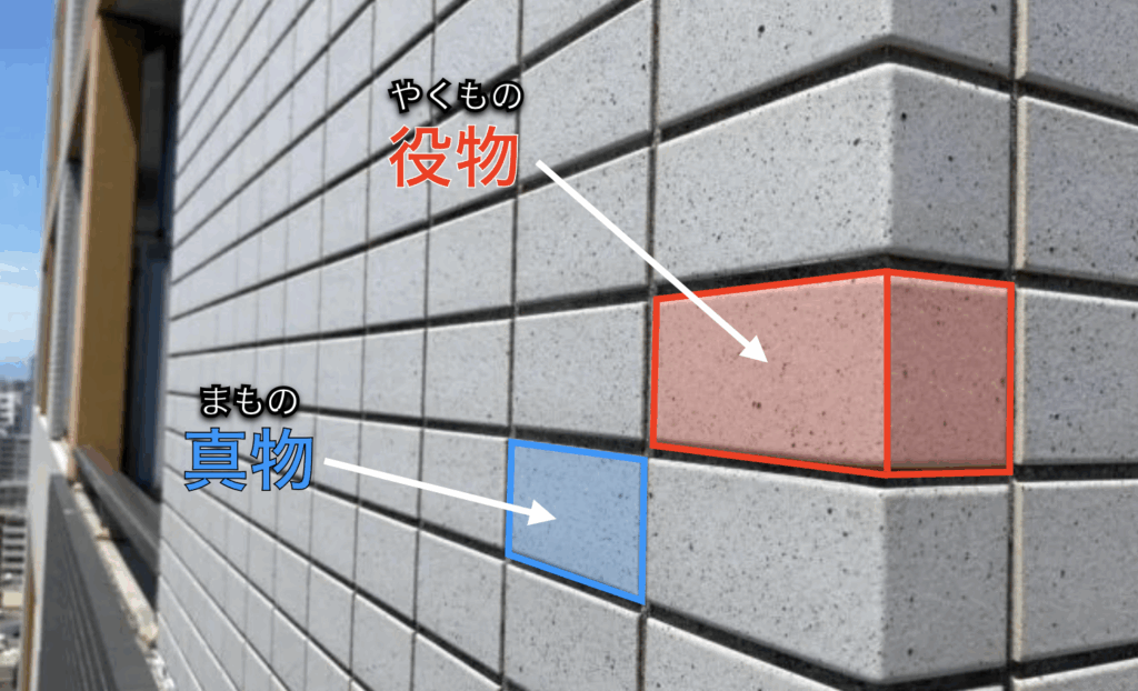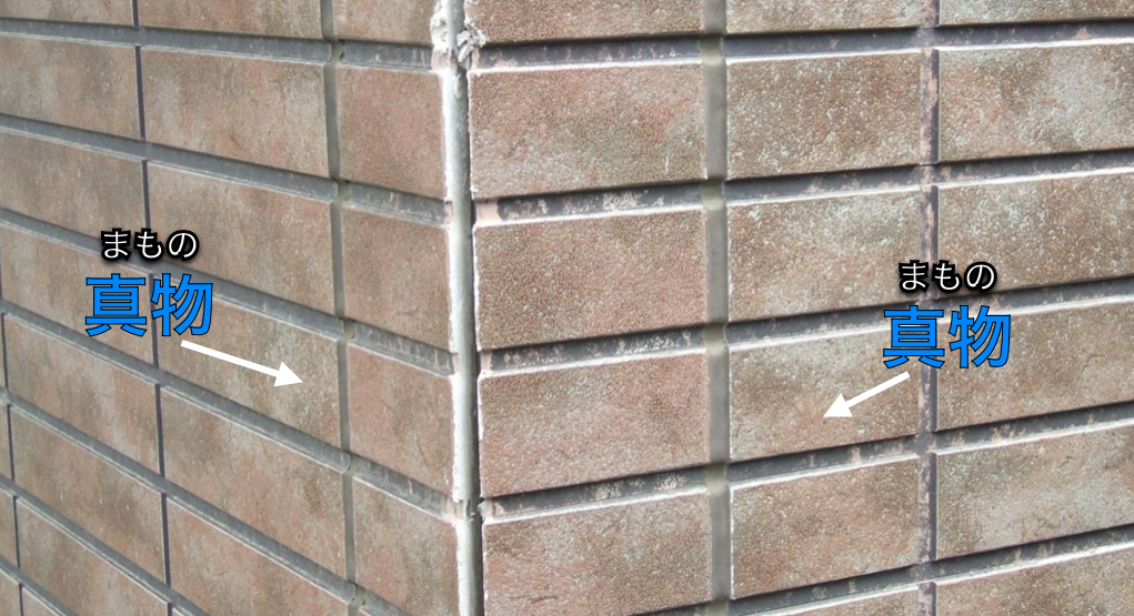 上の写真はタイル外壁の事例です。使われる部位によって名称が違います。一般部に貼られるものは「真物:まもの」と呼ばれ、コーナーのものは「役物:やくもの」と呼ばれます。