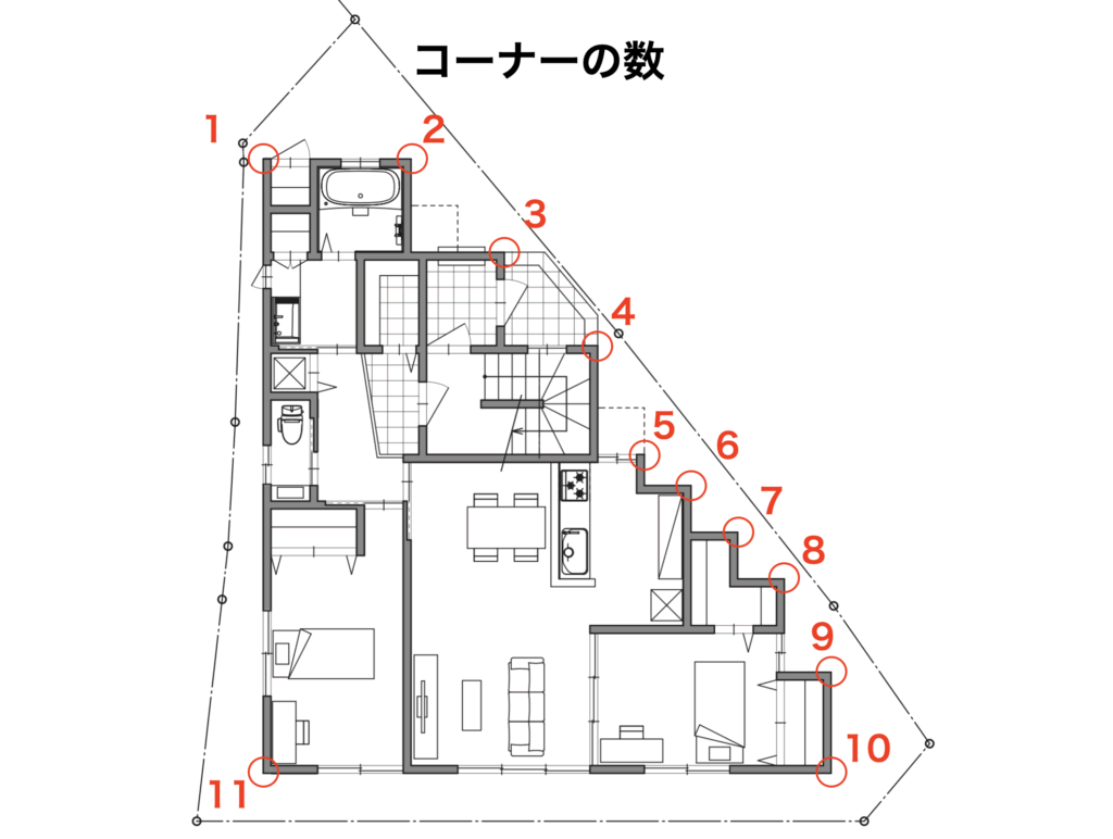 上の図面の住宅は、ほぼ三角形に近い敷地で、敷地形状に沿った平面計画を行った建物です。コストを意識した建物なら4隅+αで済みますが、このプランは11もの角があるプランになりました。