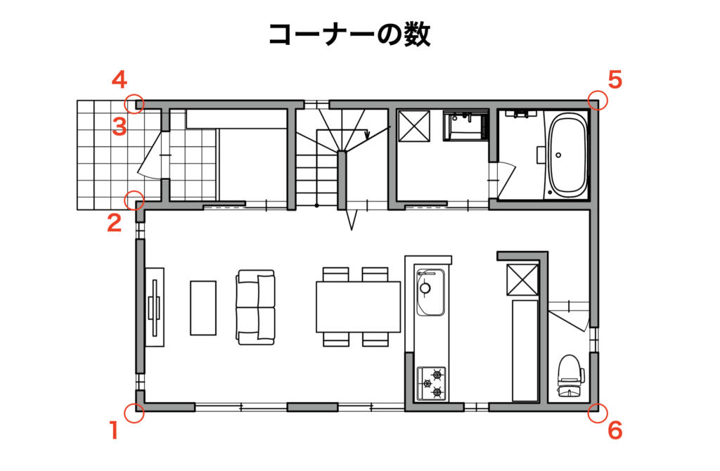 ほぼ真四角の平面プランです。玄関部分をへこましたので、コーナー2と3が出現しましたが、これは外観デザインと出入り口に雨が降り込まないような配慮をした結果です。