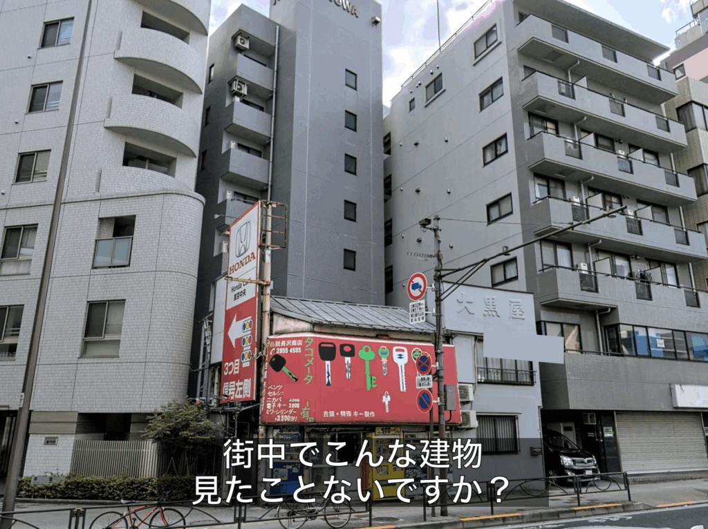 街を歩いているとたまに見かけるこんな風景。都心のメインストリートに面している低層の建物。周囲を見渡すと高層な建物が立ち並んでいます。