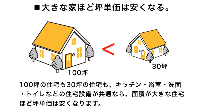 これ、上の図のように100坪の住宅だろうが30坪だろうが住宅設備が同じなら、当然述べ面積が「大きな住宅の方が坪単価は安くなり」、「小さな住宅は坪単価が高くなる」傾向があります。