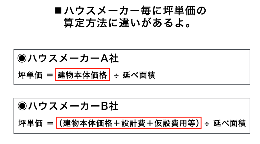 上の図を見てください。ハウスメーカーA社とB社の坪単価を求める算出方法に違いが見られます。分母である延べ面積(坪数)だけが同じですね。この分子の項目がメーカーによって違うという訳です。
